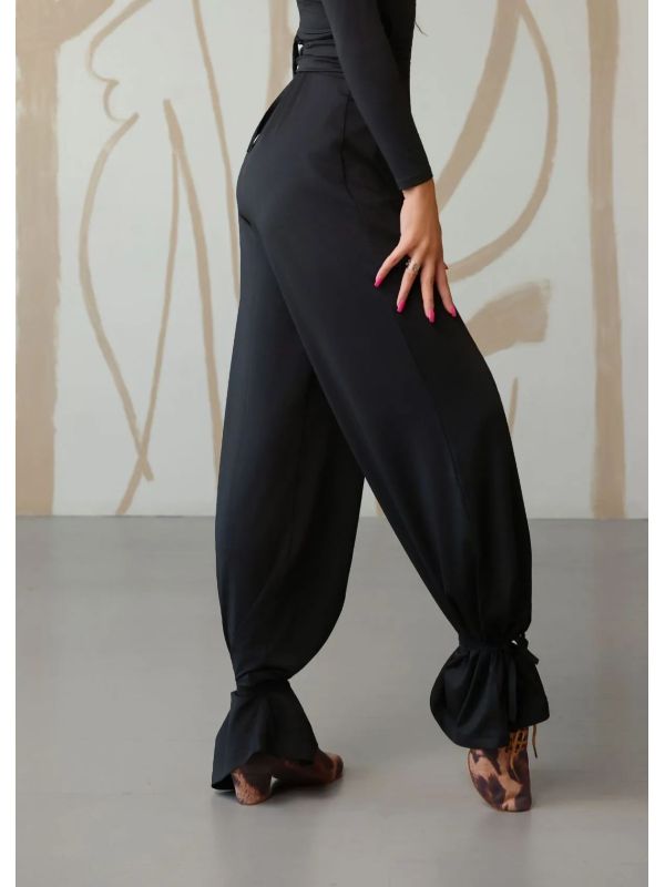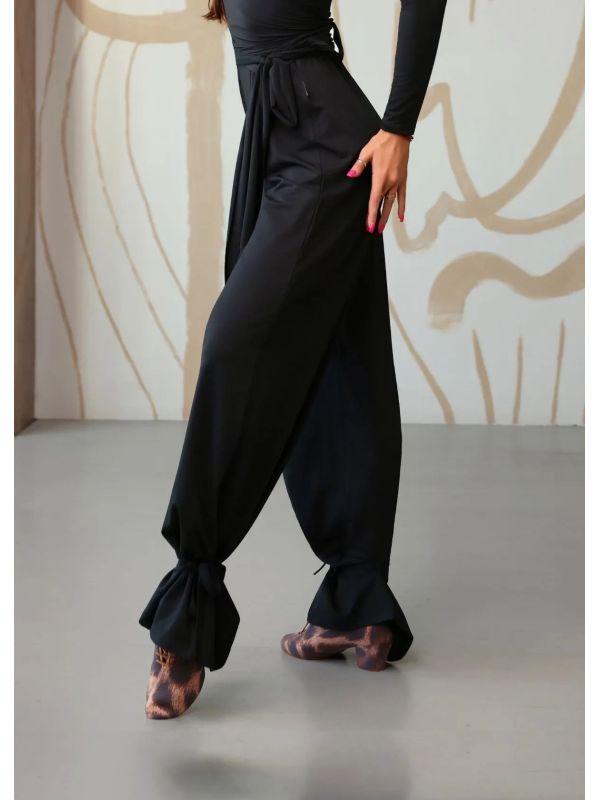 Пояс із зав’язками на стегні дозволяє коригувати посадку та акцентувати лінію талії, створюючи індивідуальний силует. Низ штанин оформлений декоративними зав’язками, які красиво фіксують форму та підсилюють динаміку рухів у танці.