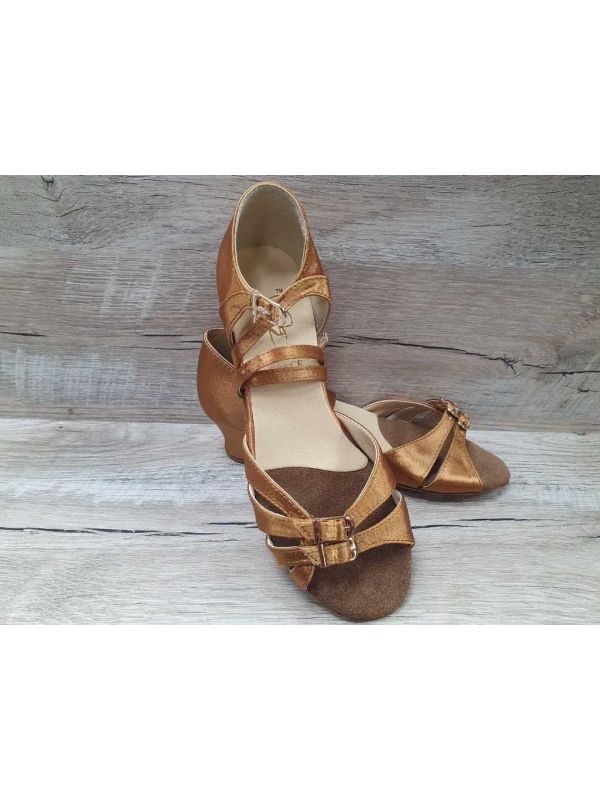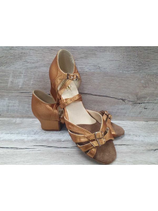 Танцювальні туфлі Клаб Денс для бальних танців на блок-підборах в бежевому сатині. Модель з двома пряжками для регулювання повноти біля пальчиків. Ця модель взуття для танців є найзручнішою і поширеною в світі. Наявність пряжок дозволяє максимально зручно зафіксувати стопу, до того ж ідеально обтягне "кісточку". Шкіряна підошва, міцний каблук з відлитого пластику, металевий супінатор, устілка під пальчиками виготовлена з натурального повсті і замші. Для дівчаток, партнер яких нижче, є можливість індивідуально пошити з каблуком висотою 1 см.