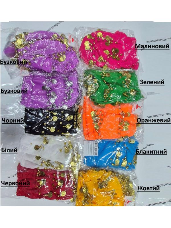 Звонкий набедренный платок с золотистыми бусинами и монистами.