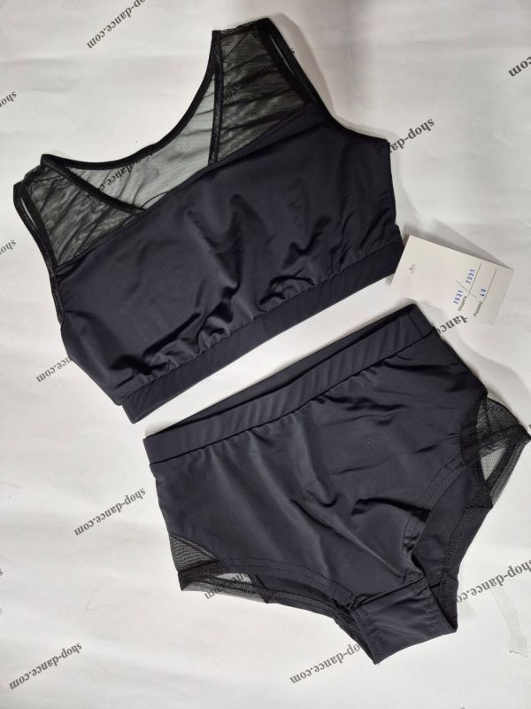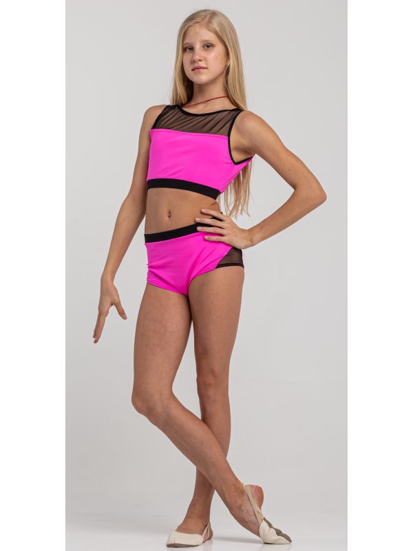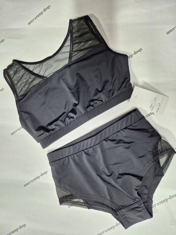 Интересный покрой топа выглядит обворожительно, и вносит в образ некую загадочность, благодоря конструктивным линиям. По переду и спинке вставки из стрейч-сетки, а его низ на плотной резинке. Шорты завышенные, отлично сидят на фигуре. Костюм подходит для занятий современными танцами, акрабатикой и другими видами спорта. Рекомендации по уходу: Рекомендуется стирать в прохладной воде вручную без замачивания.