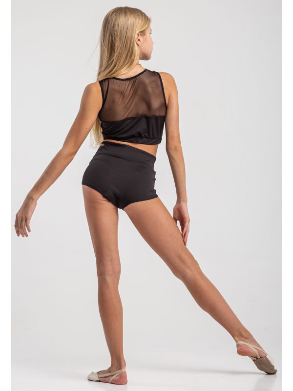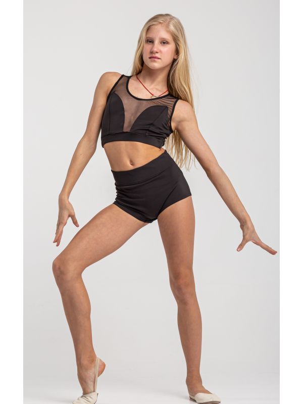 Цікавий крій топа виглядає чарівно, і вносить в образ якусь загадковість, завдяки конструктивним лініям. По переду та спинці вставки зі стрейч-сітки, а його низ на щільній гумці. Шорти завищені, чудово сидять на фігурі. Костюм підходить для занять сучасними танцями, акрабатикою та іншими видами спорту. Рекомендації щодо догляду: Рекомендується прати у прохолодній воді вручну без замочування.