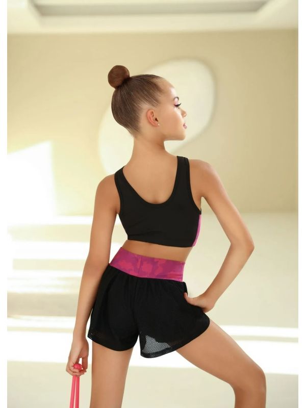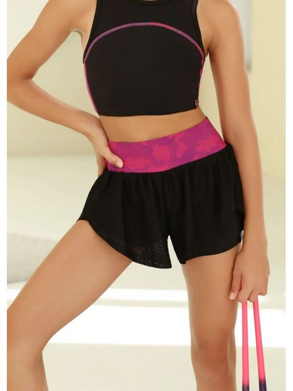 Верхній шар — легка сітчаста спідниця з боковими розрізами, яка додає динаміки й легкості силуету. Така конструкція дозволяє почуватися впевнено під час активних тренувань, не обмежуючи рухів і не відволікаючи увагу.